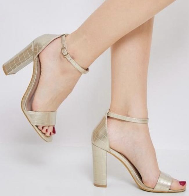 Présence de deux brides en simili cuir : une bride au pied et une bride ajustable avec une boucle dorée au niveau de la cheville.