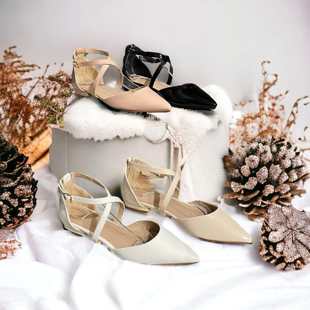 BALLERINES PLATES décolletées en simili cuir à bout pointu, dotées d’une bride à la cheville avec fermoir à boucle