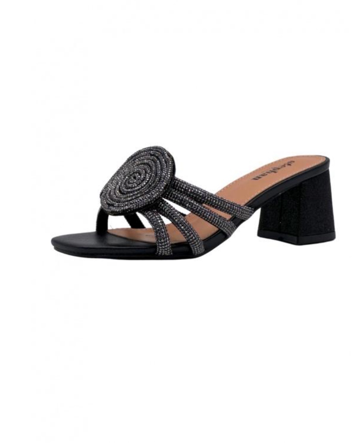 Mule élégante avec talon bloc pailleté et bride ornée pour une allure glamour. Parfait pour les boutiques ciblant une clientèle qui privilégie le luxe et le confort. Confectionnée pour enrichir une collection festive ou de soirée